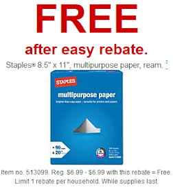 Head on over here to print out a rebate coupon for a FREE ream of Staples Multipurpose paper. Just present this coupon at checkout and a rebate form will print out at the register. If you are well stocked on paper, consider donating to a local non-profit. Price good thru 1/26.
